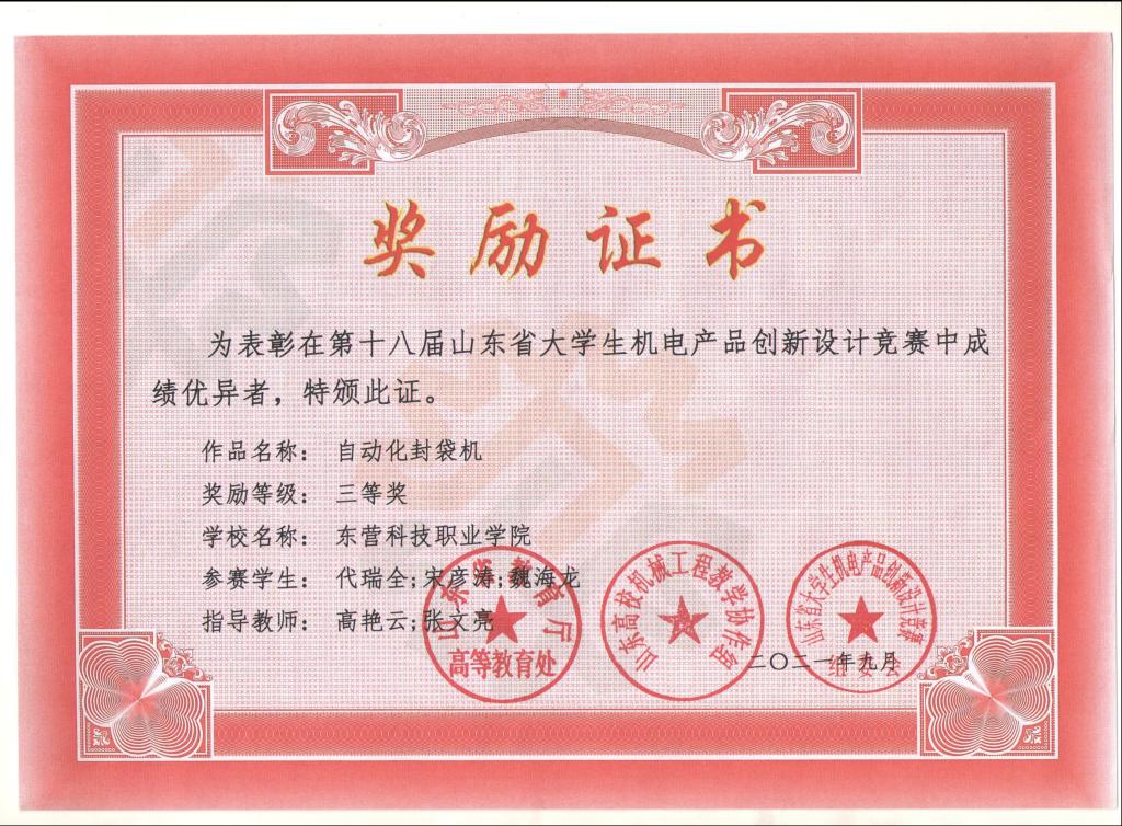 近日,第十八届(2021年)山东省大学生机电产品创新设计竞赛决赛成功举行。我校Beat365中文官方网站学生代瑞全、宋彦涛、魏海龙的团队作品《自动化封袋机》荣获三等奖。