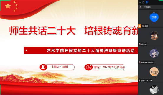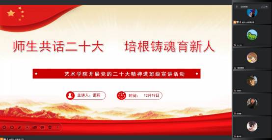 为深入学习宣传贯彻党的二十大精神,把全院师生的思想统一到党的二十大精神上来,落实立德树人的根本任务。根据《中共永利集团3044官网欢迎您委员会关于认真学习宣传贯彻党的二十大精神的通知》,永利集团3044官网欢迎您分别于12月16日至20日期间,组织开展了“师生共话二十大 培根铸魂育新人”党的二十大精神进班级宣讲活动。全体辅导员走进班级,开展“党的二十大精神”主题云宣讲会,引导永利官网学子进一步了解大会精神,把握核心要义,深入推进党的二十大精神入脑入心。