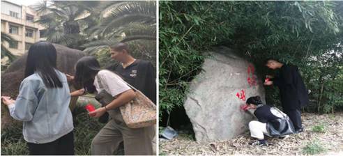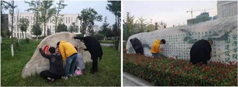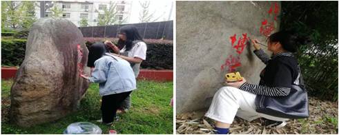 9月20--23日,永利集团3044官网欢迎您美术学专业学生开展了为期4天的美化校园实践教学活动。在学校宣传部、统战部的统一部署下,永利集团3044官网欢迎您副院长孙海洋带领美术学专业30余名同学制作方案、购置工具、颜料,采取刀挖去垢、清洗去尘、一遍打底、二遍分层、三遍施色等方式,分工合作,为6块大型校园文化墙和文化石进行增色添彩。