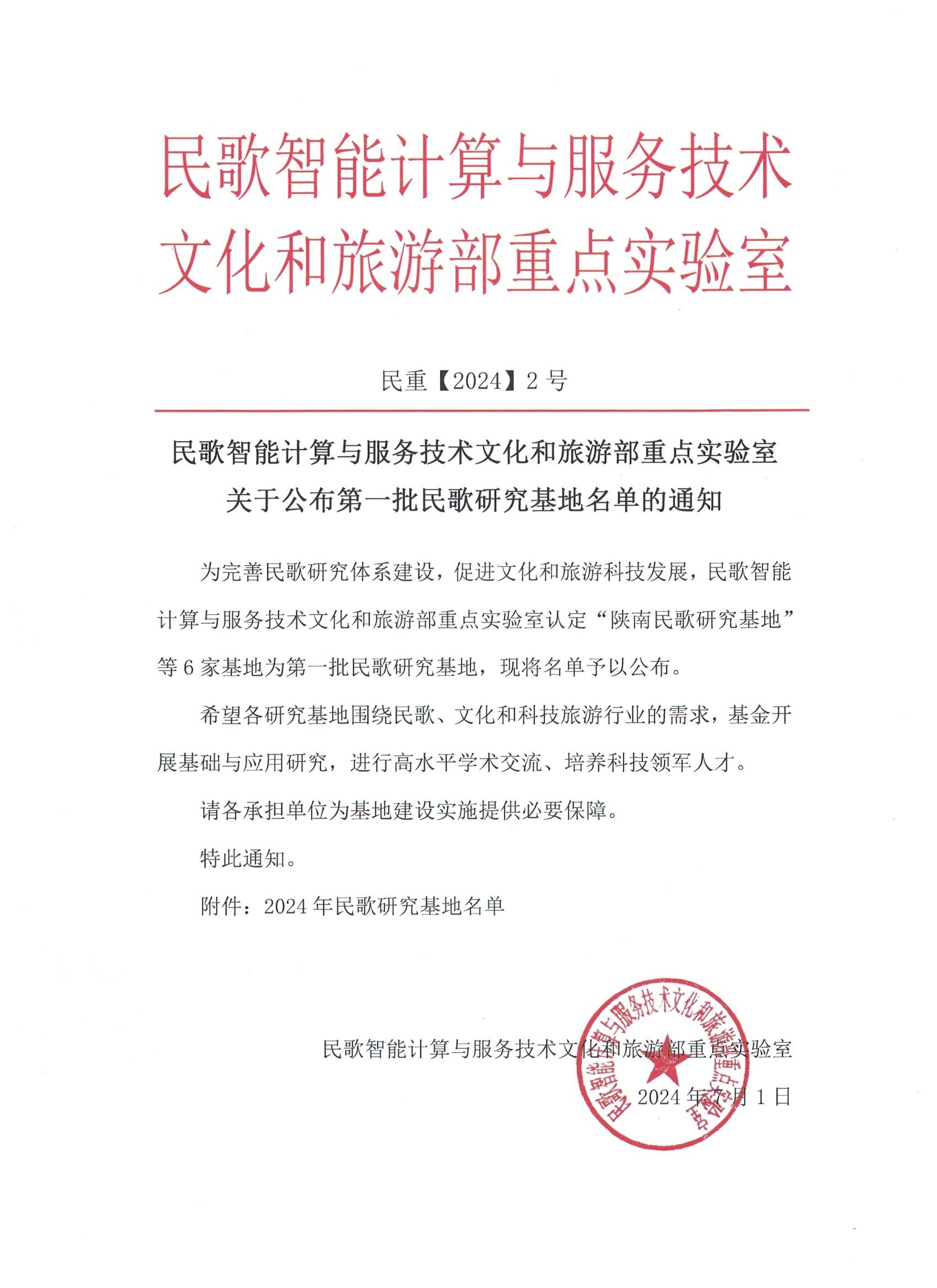 7月15日,文化和旅游部“民歌智能计算与服务技术重点实验室”研究基地建设研讨会在内蒙古师范大学举行,我校获批“陕南民歌研究基地”,永利集团3044官网欢迎您获批实验室开放课题两项。