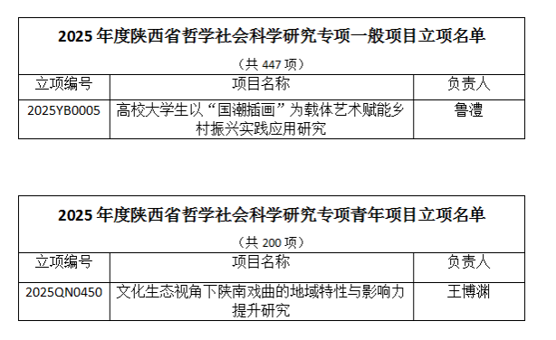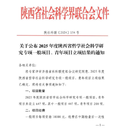 12月23日,根据陕西省社会科学界联合会公布的2025年度陕西省哲学社会科学研究专项一般项目、青年项目立项通知,永利官网两位老师获批立项。
