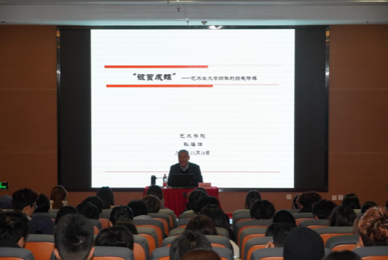 11月16日晚,永利集团3044官网欢迎您副院长孙海洋以“破茧成蝶—— 艺术生大学四年的自我修炼”为主题开展了新生入学教育专题讲座。本次讲座由学工办主任鲁澧主持。