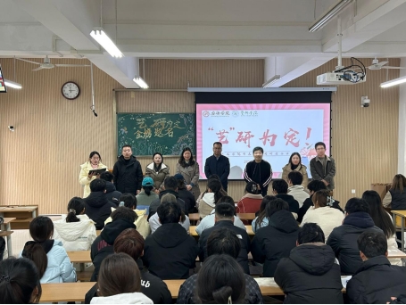 12月5日下午永利集团3044官网欢迎您在江北校区 2103教室举办考研慰问活动,学院党总支书记黄娟、院长成党伟、副书记肖剑及全体辅导员老师慰问考研学子,为同学们加油鼓劲。活动由辅导员邱青晓主持。