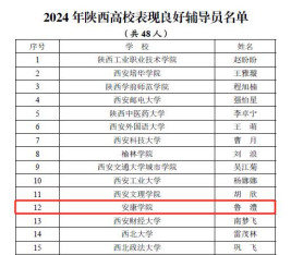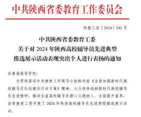 近日,中共陕西省委教育工委对2024年陕西高校辅导员先进典型推选展示活动中表现突出个人进行表扬通报,永利官网辅导员鲁澧荣获“2024年陕西高校表现良好辅导员”称号。