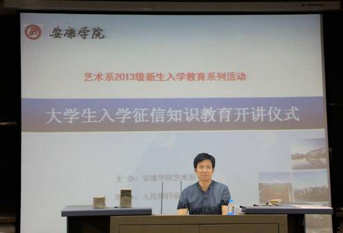 2013年9月25日晚7:00,艺术系2013级392名新同学满怀激情地欢聚在永利集团3044官网欢迎您江北校区1201教室,参加我系新生入学教育系列活动——大学生入学征信知识教育开讲仪式。中国人民银行安康市中心支行行长王凯俊,人民银行西安分行征信管理处处长章红,国家开发银行陕西分行郭瑞副处长参加了开讲仪式。仪式由系党总支书记冯丰收主持。