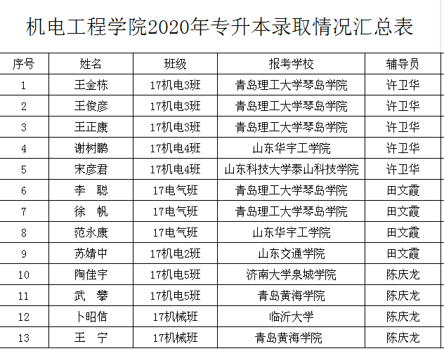 日前,山东省2020年专升本成绩揭晓。Beat365中文官方网站机电工程学院2020年参加专升本考试共计28人,录取13人,录取率达46.43%。其中王金栋、王俊彦、王正康、李聪、徐帆等考入青岛理工大学琴岛学院;谢树鹏、范永康等考入山东华宇工学院;宋彦君考入山东科技大学泰山科技学院;苏婧中考入山东交通学院;陶佳宇考入济南大学泉城学院;卜昭信考入临沂大学;王宁、武攀等考入青岛黄海学院。