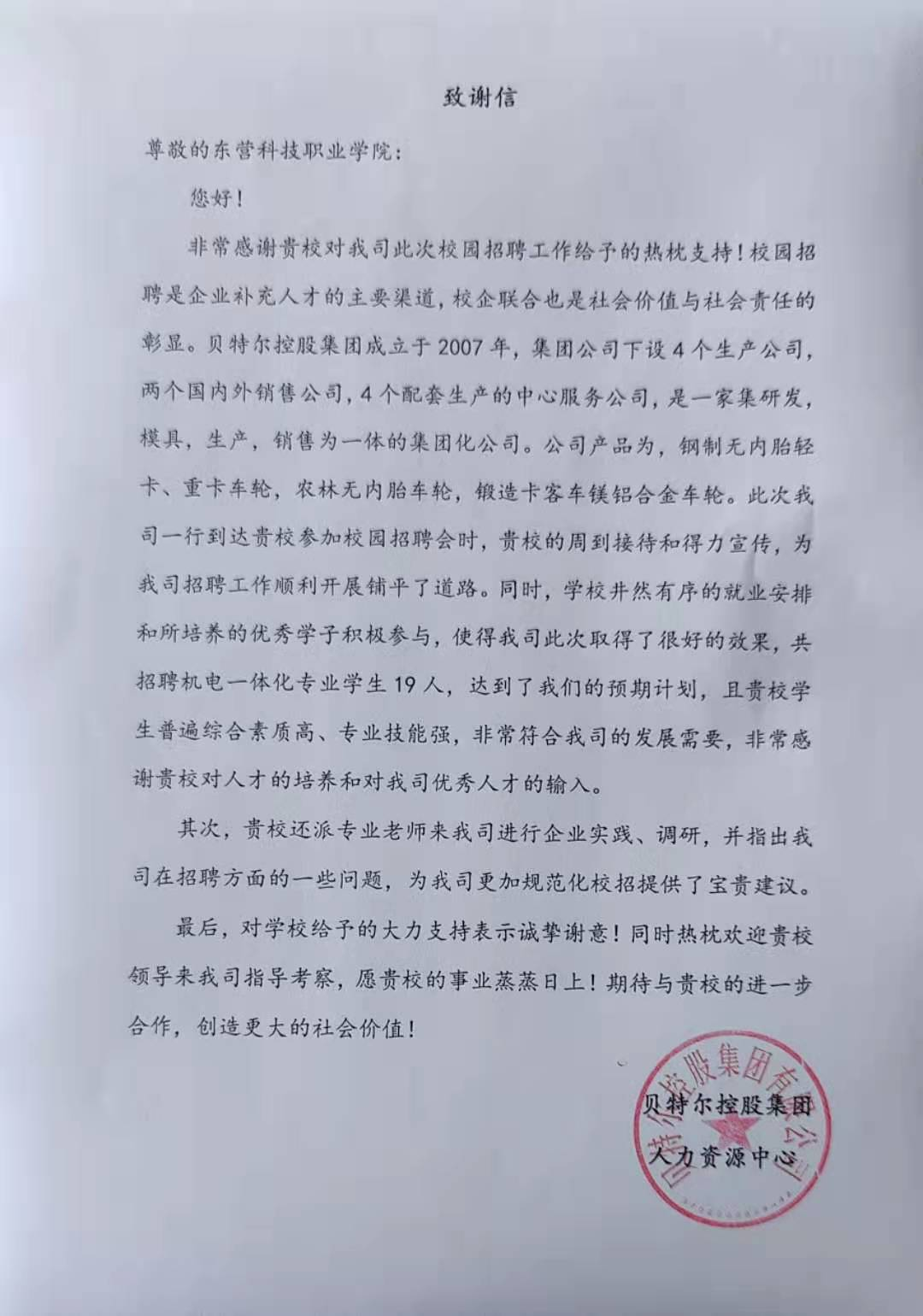 2021年8月12日我校收到来自贝特尔控股集团的致谢信,信中高度评价了我校18级机电一体化专业实习学生的表现,反应我校学生综合素质高,专业技能强,对我校老师的技能培养,学生的日常学习中给予了肯定,充分肯定了Beat365官网毕业生的专业能力、综合素质以及学生的创新精神。