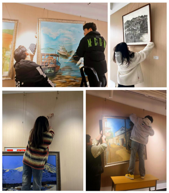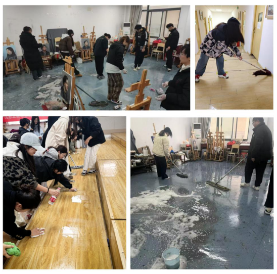 活动伊始,王兵老师首先向同学们强调了劳动实践的纪律要求和安全注意事项讲解了此次劳动实践活动的目的、要求和价值意义,鼓励同学们积极参与其中。同时对美术作品布展中如何排布作品顺序,如何悬挂作品等细节做了示范讲解;对实训室的卫生清洁、地面墙面清理、桌椅画架摆放、物品整理等环节做了细致要求。随后,同学们分组展开行动,迅速投入到紧张有序的劳动实践之中。参与美术作品布置的同学们,把国画、油画等作品依次摆开,整齐的布置在展厅墙面上;参与实训室卫生打扫的同学,不放过任何一个卫生死角,把地面拖洗的干净整洁,把桌椅摆放的整整齐齐,营造出窗明几净的实训室环境。劳动过程中,同学们相互协作,配合默契,干劲十足,现场洋溢着欢声笑语,忙碌的身影随处可见。