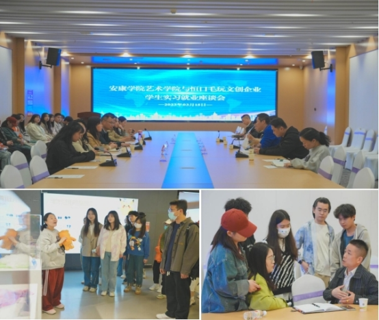 接下来,学院走访团来到安康米小点品牌管理有限公司。该公司是一家集毛绒玩具文化、IP原创、品牌孵化、柔性制造、供应链于一体的毛绒玩具及毛绒元素的生产加工企业,产品远销30多个国家和地区。座谈会上,成党伟向公司介绍了学院的基本情况和设计专业人才培养特色。总经理朱明华介绍了公司发展的历程、主要业务及取得成果,随后双方在人才培养、实践实习等方面达成诸多共识,并签订了毕业生就业实习基地。在公司展厅参观时,朱明华为同学们通过讲述一只毛绒潮玩的“诞生记” ,系统介绍了文案策划、产品设计、客户体验、营销策略等产品从原创设计到进入市场的全流程,使同学们了解了毛绒玩具最新行业前景和具体专业要求,进一步明确了就业方向。