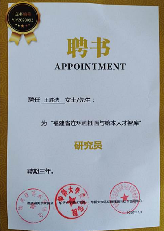 近日,永利官网王胜选副教授被福建省美术家协会、华侨大学美术学院、华侨大学连环画插画与绘本创研中心聘为“福建省连环画插画与绘本艺术人才智库”研究员,聘期三年。