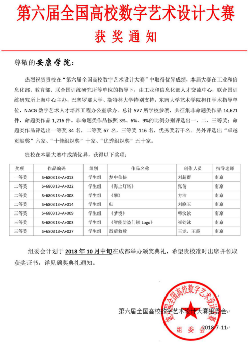 近日,2018年第六届全国高校数字艺术设计大赛比赛结果公布。永利官网学子首次参加该项赛事,与包括北京大学、中国美术学院、东南大学、北京师范大学、华中师范大学、西北大学等众多985、211名校在内的全国共计577所高校学生同场角逐,永利官网学子最终分别获得一等奖1项、二等奖3项、三等奖3项的喜人成绩。