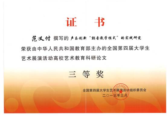 在近日结束的由教育部主办的全国第四届大学生艺术展演活动中,我系学科带头人范义付副教授撰写的《声乐创新“颤音教学模式”的实践研究》荣获高校艺术教育科研论文三等奖,这是范义付副教授自2009年后再次获得此项奖励。该论文是永利官网教研立项项目成果,它的获奖也标志着永利官网声乐教学研究水平达到国内较高水平。