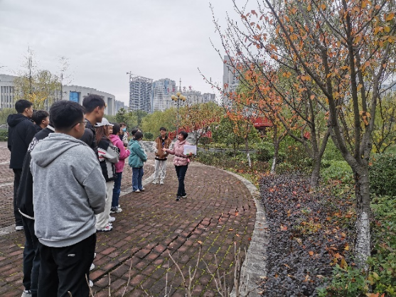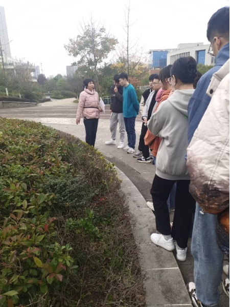 现场教学在江北校区进行。杨湘涛老师以江北校区1、2号教学楼与滨湖景区之间的植物景观配置为主题,讲解和启发学生学习景观植物在造景中的应用,根据课程特点植入课程思政主题——审美素养与文化自信。