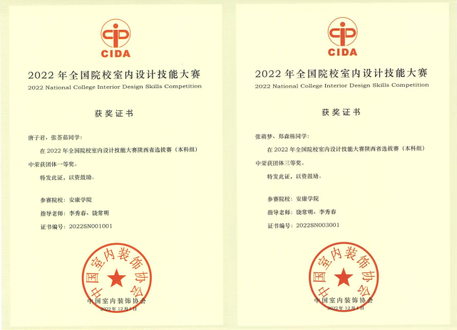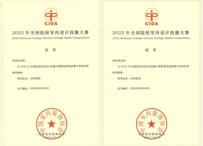 近日,2022年全国院校室内设计技能大赛(陕西赛区)比赛结果揭晓。由永利官网青年教师饶常明、李秀春指导的2020级视觉传达设计专业唐子君、张荟茹同学荣获本科组团体“一等奖”,并受邀参加国赛;2019级视觉传达设计专业张萌梦、郑森栋同学荣获本科组团体“三等奖”。饶常明、李秀春获本次大赛“优秀指导教师”。