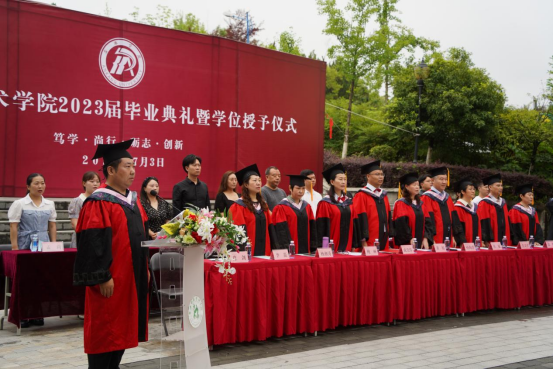 伴随着动听歌声,学院院长成党伟和导师们为毕业生们一一正冠拨穗,颁发学位证书,并合影留念。