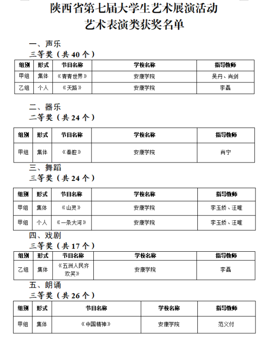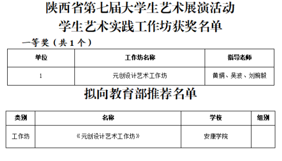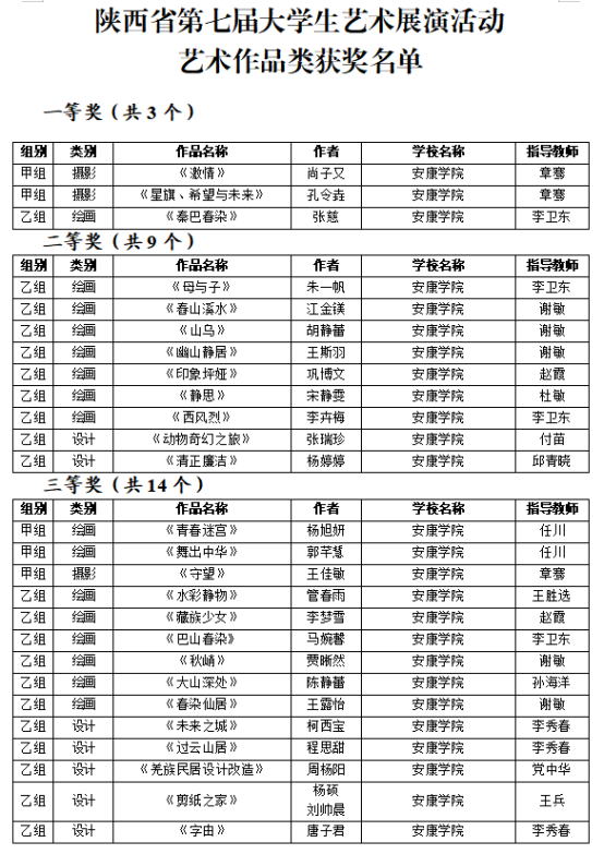 12月8日,省教育厅公布了陕西省第七届大学生艺术展演活动评选结果,永利官网参赛师生共获得各类奖项34项。其中《元创设计艺术工作坊》获一等奖,并被推荐到教育部参加全国第七届大学生艺术展演;艺术作品类获一等奖3项、二等奖9项、三等奖14项;艺术表演类获二等奖1项、三等奖6项。