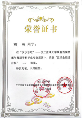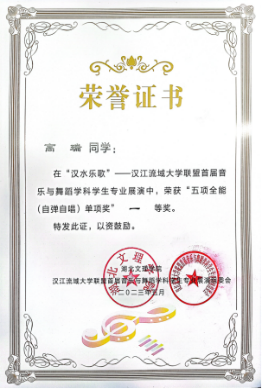 5月23日-26日,“汉水乐歌——汉江流域大学联盟首届音乐与舞蹈学科学生专业展演”活动在湖北文理学院举行。我校音乐学专业学生在此次展演中取得佳绩,共获得五项全能综合奖一等奖1项、二等奖1项、三等奖2项,自弹自唱一等奖1项、二等奖1项,钢琴单项二等奖1项、三等奖2项,器乐单项二等奖1项,舞蹈单项三等奖1,声乐单项二等奖2项,三等奖1项等14项奖项,充分展现了我校音乐学专业学生专业技能和办学质量。