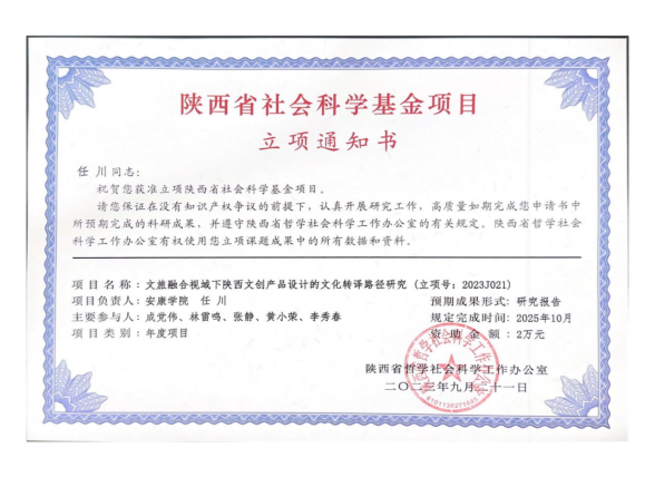 4.9月21日,陕西省哲学社会科学工作办公室公布了2023年陕西省社会科学基金年度项目立项名单。永利官网任川博士的“文旅融合视域下陕西文创产品设计的文化转译路径研究”(2023J332)课题获得2023年度立项,这是任川博士2023年继省社科联社科基金项目之后获批的第二个纵向项目,也是永利集团3044官网欢迎您高层次人才队伍建设的重要成果呈现之一。近三年来,永利集团3044官网欢迎您引进博士引育博士17名,晋升教授2名,高层次人才队伍建设初见成效。