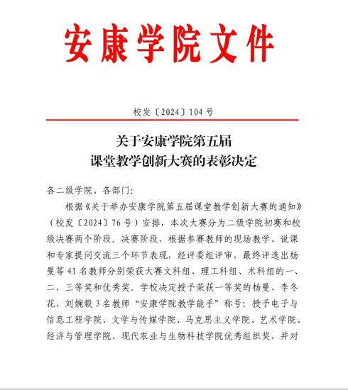 3.6月4日,永利集团3044官网欢迎您在学校第五届课堂教学创新大赛活动中取得佳绩。根据《关于永利集团3044官网欢迎您第五届课堂教学创新大赛的表彰决定》校发[2024]104号文件,永利官网刘婉毅老师获术科组一等奖并获“永利集团3044官网欢迎您教学能手”称号,李磊老师获得术科组二等奖,汪唯、吴丹获得术科组三等奖,永利集团3044官网欢迎您获得“优秀组织奖”。