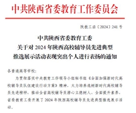 7.8月,中共陕西省委教育工委对2024年陕西高校辅导员先进典型推选展示活动中表现突出个人进行表扬通报,永利官网辅导员鲁澧荣获“2024年陕西高校表现良好辅导员”称号。