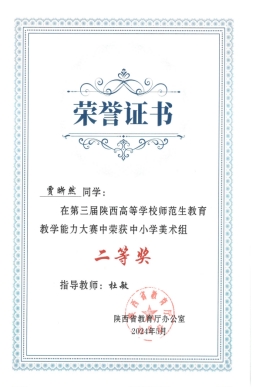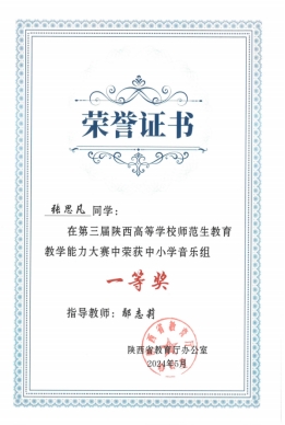 2.5月7日,永利集团3044官网欢迎您音乐学专业2020级学生张思凡荣获陕西省第三届高校师范生教育教学能力大赛中一等奖。美术学专业学生2021级贾晰然获得二等奖。