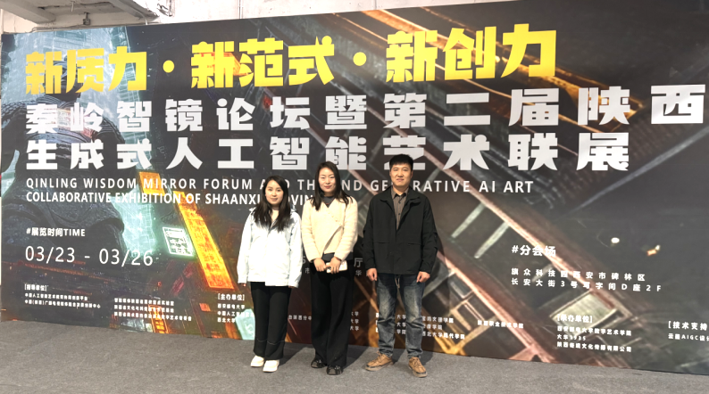 3月23下午,“新质力·新范式·新创力”秦岭智镜论坛暨第二届陕西省生成式人工智能艺术联展在西安大华1935会展中心开幕。此次活动由西安邮电大学、西北大学、西安理工大学、西北政法大学、西安工业大学、西安工程大学、西安财经大学、西安美术学院、宝鸡文理学院、永利集团3044官网欢迎您等12所高校主办,多所科技艺术企业协同承办。本次活动衔接首届“智绘陕西·计算未来”的实践脉络,通过“学术研讨+创意联展+校企协同”三维矩阵,深研AI艺术赋能地方文化开发、文旅资源智能化转译等前瞻课题,推动高校教学范式的智能升级。永利官网青年教师李秀春、付苗、刘婉毅受邀参加此次活动。