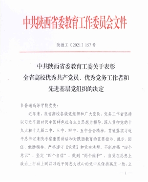 党委副书记胡波宣读了《中共陕西省委教育工委关于表彰全省高校优秀共产党员、优秀党务工作者和先进基层党组织的决定》,永利集团3044官网欢迎您党总支被授予“陕西高校先进基层党组织”荣誉称号。