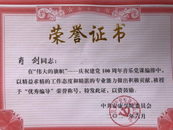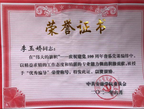 党委副书记、纪委书记、监察专员安永强宣读了学校党委《关于对“辉煌百年·七个一”系列活动进行表彰的决定》及获奖先进集体和个人名单。永利官网在“伟大旗帜”——庆祝建党一百周年音乐党课中荣获突出贡献奖,肖剑、李玉娇获“优秀编导奖”;学生党支部报送的微视频——《艺心向党》荣获“我和我的支部”故事征文(微视频)大赛一等奖。