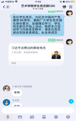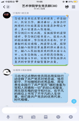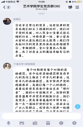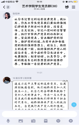 为庆祝中国共产党成立99周年,激励广大学生党员强化身份认同、加强理论学习,进一步坚定“四个自信”、“两个维护”。2020年6月30日上午,艺术学院学生党支部利用QQ线上平台,组织召开“学榜样,践初心”庆“七一”主题党日活动。本次活动由学生党支部书记魏麟主持,全体学生党员参加