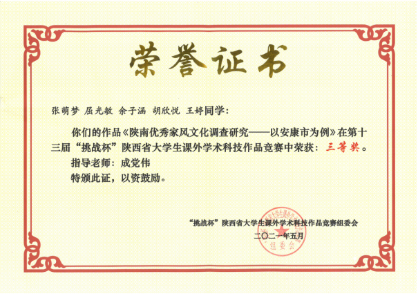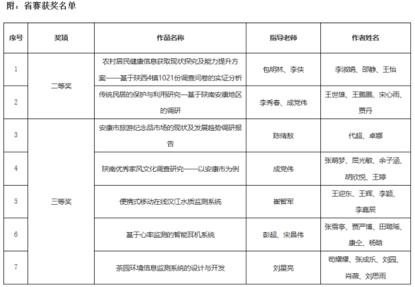 近日,由团省委、省委教育工委、省科协、省社会科学院、省学联共同主办,陕西师范大学承办的第十三届“挑战杯”陕汽集团陕西省大学生课外学术科技作品竞赛闭幕式暨颁奖仪式在陕西师范大学终南音乐厅举行。我校共有7件作品获奖,其中二等奖2项、三等奖5项。