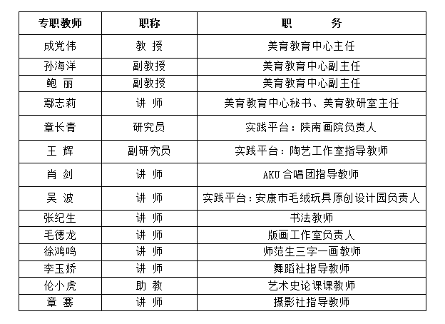 目前我校共有公共艺术类专职教师13人,其中高级职称5人,讲师职称7人,其中研究生以上学历8人,同时外聘教师10人:安康市群艺馆周墙研究员,安康市美协主席李剑平,美协副主席樊光矢、申小荣先生,安康知名书画名家张枫、何涛、王关棣,紫阳民歌传承人黄杰,二胡名家王伟权、张定柱。